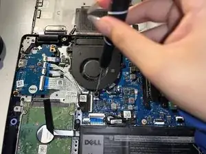 Выверните два винта, удерживающих вентилятор, с помощью отвертки Phillips #00.