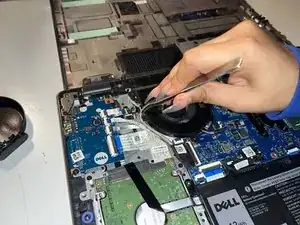 Отсоедините коричневый провод, намотанный вокруг вентилятора, пинцетом.