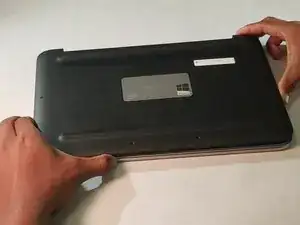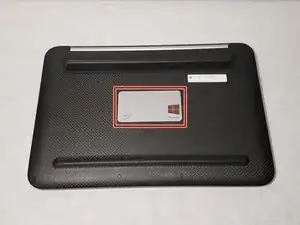 Закройте ноутбук, переверните его и подденьте маленькую заднюю крышку плоской отверткой. Крышка будет висеть на петлях после открытия.
