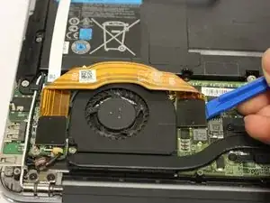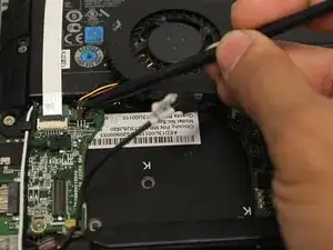 Пластиковым инструментом для вскрытия iFixit отсоедините провод, подключённый к вентилятору.