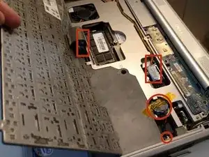 Слегка приподнимите клавиатуру, чтобы отсоединить шлейф клавиатуры от системной платы.