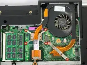 Сначала открутите шесть винтов, удерживающих вентилятор и радиатор, крестовой отверткой Phillips #1. Затем используйте Phillips #1, чтобы удалить один винт возле нижней части радиатора.