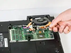 Будьте осторожны, не тяните слишком сильно, так как питающий разъём всё ещё соединяет вентилятор с ноутбуком.