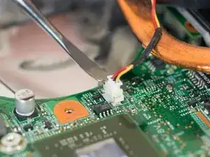 Используйте пальцы или лопаточку, чтобы снять питающий разъём, соединяющий вентилятор с ноутбуком, потянув его строго вверх с материнской платы.