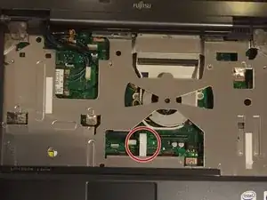 Чтобы снять металлическую подкладку клавиатуры, сначала необходимо отключить шлейф, подключённый к тачпаду. Крепко захватите основание шлейфа там, где он соединяется с материнской платой, и аккуратно потяните его вверх, чтобы отсоединить.