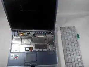 К клавиатуре подсоединён шлейф к материнской плате. Поднимайте клавиатуру осторожно, чтобы не повредить её.
