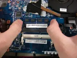 Одновременно сдвиньте защёлки слотов оперативной памяти наружу двумя большими пальцами, чтобы освободить и вынуть модуль памяти.