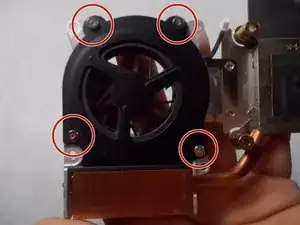 Найдите 4 точки, где вентилятор прикреплён к металлической защитной крышке винтами.