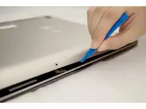 Используйте пластиковую открывающую инструмент, чтобы поддеть нижнюю панель по периметру, пока она не освободится.