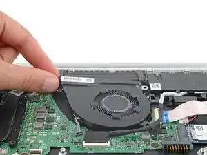 На некоторых моделях может быть полоса ленты над небольшим зазором между вентилятором и тепловой трубкой. Используйте пинцет или пальцы, чтобы поддеть и удалить её перед снятием вентилятора.