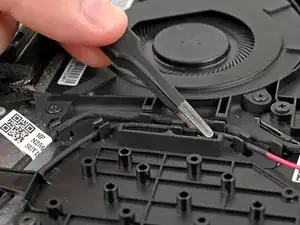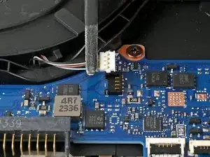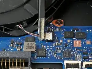 Используйте пинцет, лопаточку или пальцы, чтобы поднять кабель питания постоянного тока из фиксирующих держателей рядом с вентилятором.