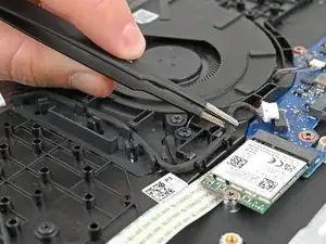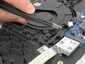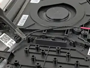 Используйте пинцет, лопаточку или пальцы, чтобы вытащить антенну беспроводной сети из фиксирующих держателей рядом с вентилятором.