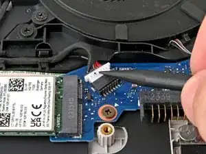 Вставьте одну сторону пинцета с притуплённым носиком под кабель вентилятора как можно ближе к разъёму.