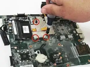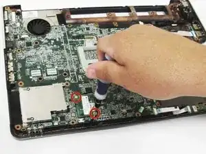 Открутите два 2-мм винта в правом нижнем углу материнской платы с помощью отвёртки Phillips #00.