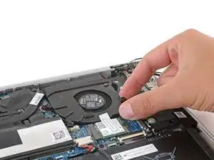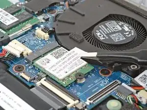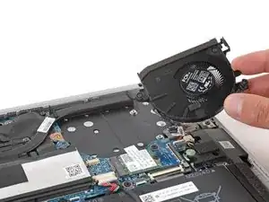Сдвиньте вентилятор в сторону правого края ноутбука, чтобы вытянуть верхний левый угол из-под радиатора.