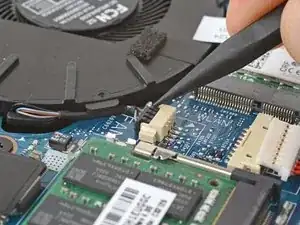 Подведите один конец изогнутых пинцетов под металлическую шейку одного из коаксиальных разъемов на модуле WLAN (Wi‑Fi), расположенном прямо под вентилятором.