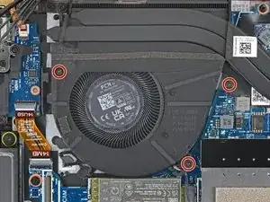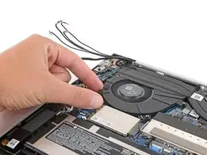 Потяните вентилятор в сторону левого края ноутбука, чтобы верхний правый угол выскользнул из-под радиатора.