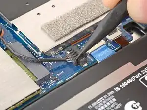 Сдвиньте одну сторону угловых пинцетов под металлическую шейку одного из коаксиальных разъёмов на модуле WWAN (сотовая связь).