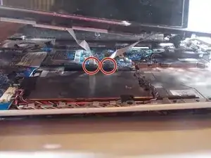 Удалите отмеченные кружком винты с синей печатной платы и поднимите узел вентилятора, чтобы вынуть его из устройства.