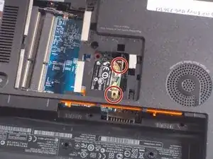 Переверните устройство на спинку и удалите отмеченные кружком винты с карты Wi‑Fi.