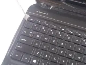 Переверните ноутбук лицевой стороной вверх и аккуратно подденьте рамку клавиатуры, чтобы вынуть её из корпуса.