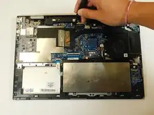Отключите вентилятор от материнской платы и поднимите вентилятор вместе с радиатором из корпуса ноутбука.