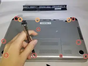 Открутите все девять чёрных винтов 7,09 мм, включая винт под небольшой прямоугольной заглушкой.