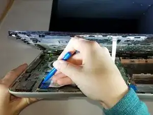 Снимите пластиковую кромку с помощью синего пластикового инструмента для вскрытия.