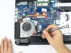 После отключения вентилятора от материнской платы открутите винты длиной 6 мм с помощью отвёртки Phillips #1, которые крепят вентилятор к ноутбуку. Снимите вентилятор.