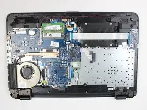 После снятия задней панели Вы увидите вентилятор в левом нижнем углу ноутбука.