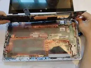 Используйте металлическую лопатку, чтобы отжать четыре угла панели клавиатуры. Угол выделен красным, как показано на первой фотографии.