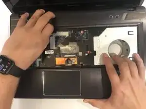 Переверните ноутбук обратно и отверните винт, фиксирующий оптический привод.