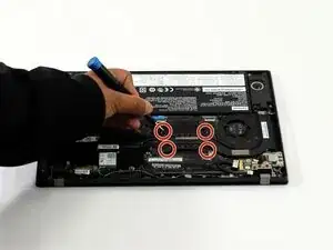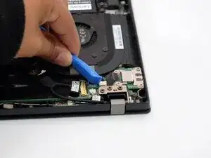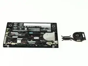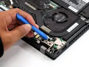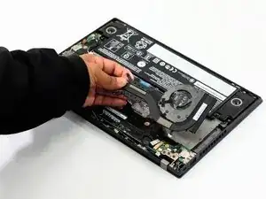 Удалите сборку вентилятора с внутреннего края ноутбука.