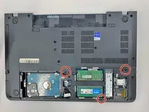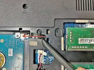 Используйте биту размера 0, чтобы удалить три винта 3 мм в рамке под дисководом, затем переверните ноутбук и откройте его.