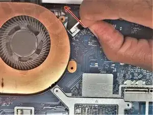 ПРИМЕЧАНИЕ: Если вентилятор цел, но загрязнён, используйте баллончик со сжатым воздухом и направьте его на вентилятор, чтобы удалить пыль и мусор, затем соберите ноутбук в обратном порядке, следуя инструкциям в обратной последовательности. Если проблемы с вентилятором сохраняются, следуйте этому руководству для его замены.