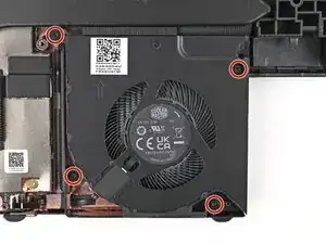 Используйте отвертку T5 Torx, чтобы затянуть четыре стационарных винта, фиксирующих вентилятор.