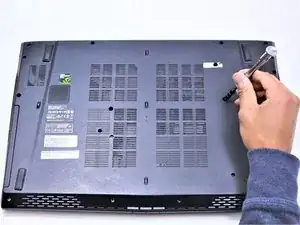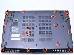 С закрытым и перевернутым ноутбуком открутите девятнадцать винтов Phillips #1 длиной 5.5 мм, которые крепят заднюю крышку.