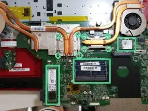Если вы заменяете только клавиатуру, можете пропустить шаг 18, а затем пропустить шаг с удалением адаптера WiFi. Вентилятор ЦП, m.2 SSD, ОЗУ и адаптер WiFi (обозначены зеленым) будут сняты вместе с основной платой, что даст вам доступ к клавиатуре.