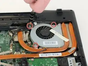 Удалите три винта размером 5 мм с вентилятора с помощью отвертки Phillips #00.