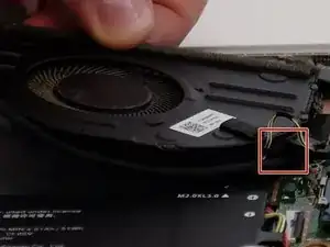 Отключите толстый чёрный провод, подключённый к разъёму на боковой стороне вентилятора.