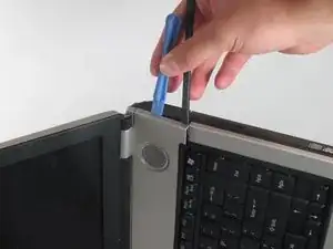 Подденьте верхнюю часть корпуса ноутбука (над клавиатурой), содержащую динамики, используя и лопатку, и инструмент для открывания, чтобы отжать корпус от компьютера.