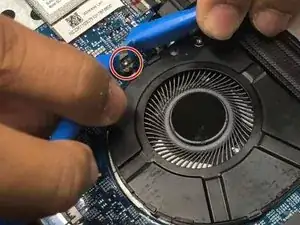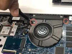 Используйте два инструмента для вскрытия, чтобы отсоединить вентилятор охлаждения от материнской платы.