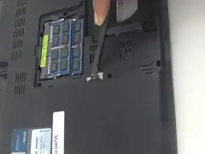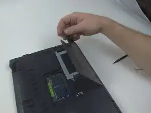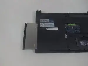 Слегка подденьте язычок чёрной лопаткой и аккуратно потяните оптический привод от ноутбука, чтобы извлечь его.