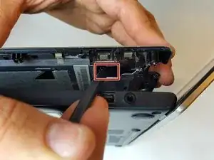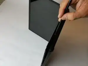 Используя плоскую часть пластикового шпателя, нажмите на угол черной поверхности, пока первый зажим не освободится.