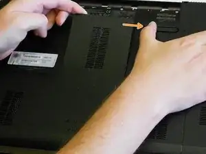 Защёлка, показанная на дне ноутбука, удерживает аккумулятор на месте. Сдвиньте защёлку влево, чтобы извлечь аккумулятор.