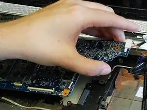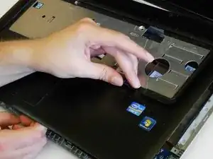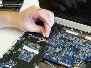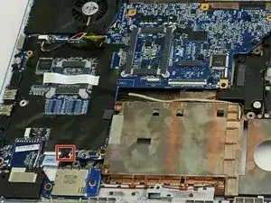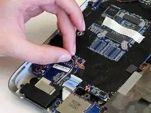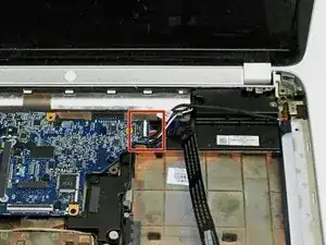 Отключите провод динамика от разъёма в нижнем левом углу ноутбука.