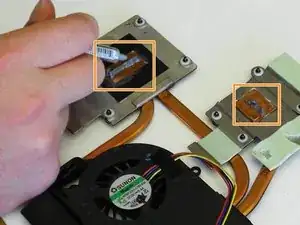 Нанесите небольшое количество новой теплопроводящей пасты в центр медной части радиатора. Обе области, требующие новой пасты, отмечены красными рамками.