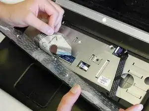Поднимите язычок, закрывающий ленточный кабель ридера SD-карт, чтобы отсоединить его.