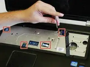 Осторожно поднимите четыре пластиковые защёлки под клавиатурой и аккуратно отключите лентовые кабели под каждой из них.