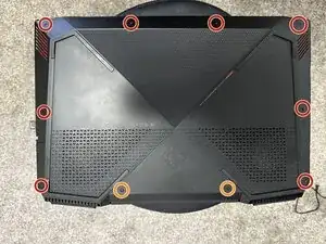 Полностью выключите ноутбук. Отверткой Phillips #2 отверните 10 винтов на чёрной крышке. Два центральных винта (на фото отмечены оранжевым) в задней части являются удерживающими и не требуют полного извлечения, их достаточно ослабить.